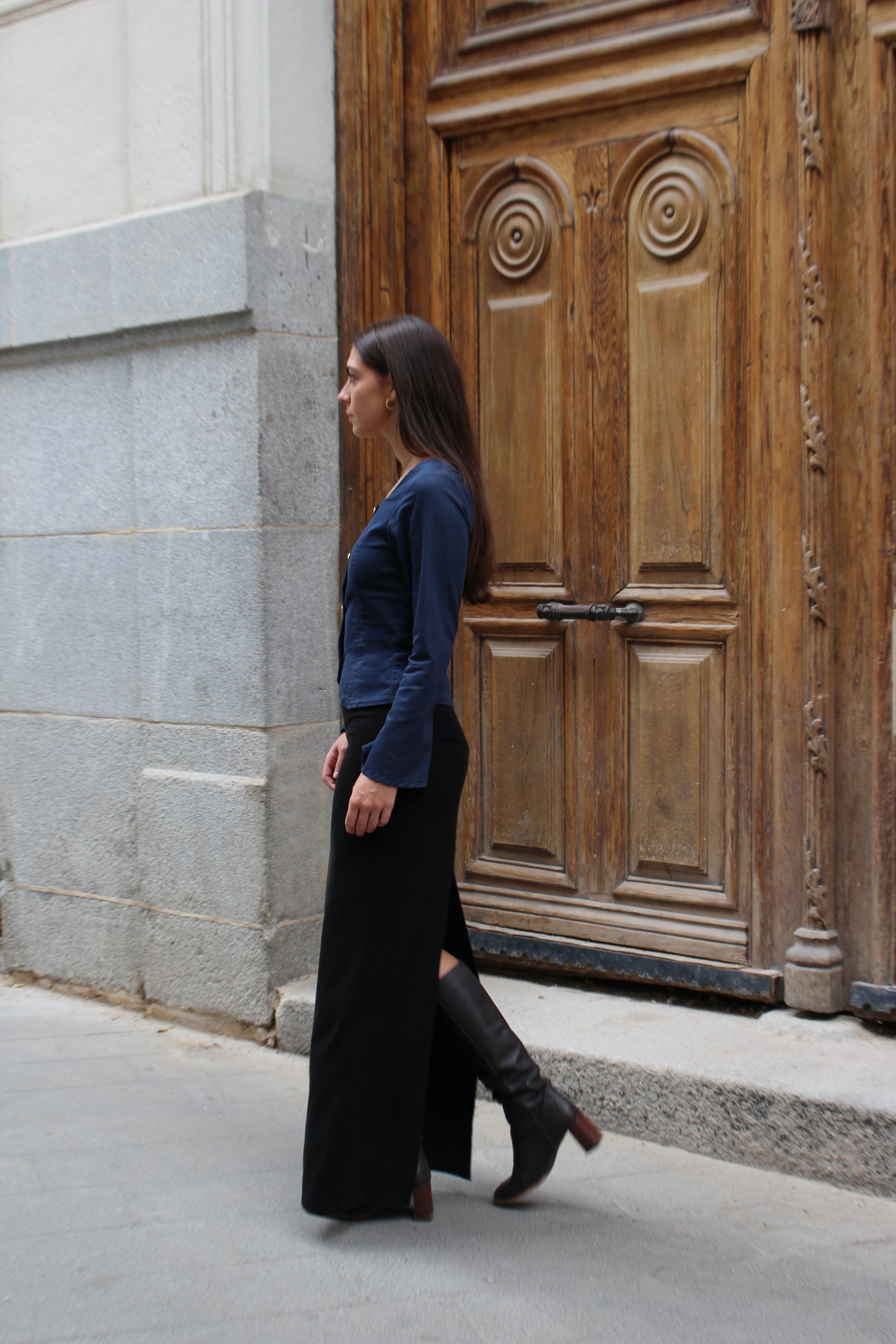 Se adapta a la cadera con una caída recta y elegante, incorporando una abertura trasera y una cremallera invisible que garantizan un ajuste perfecto. Un clásico sofisticado y chic, que reinterpreta la falda tradicional con un toque contemporáneo y una silueta impecable.
