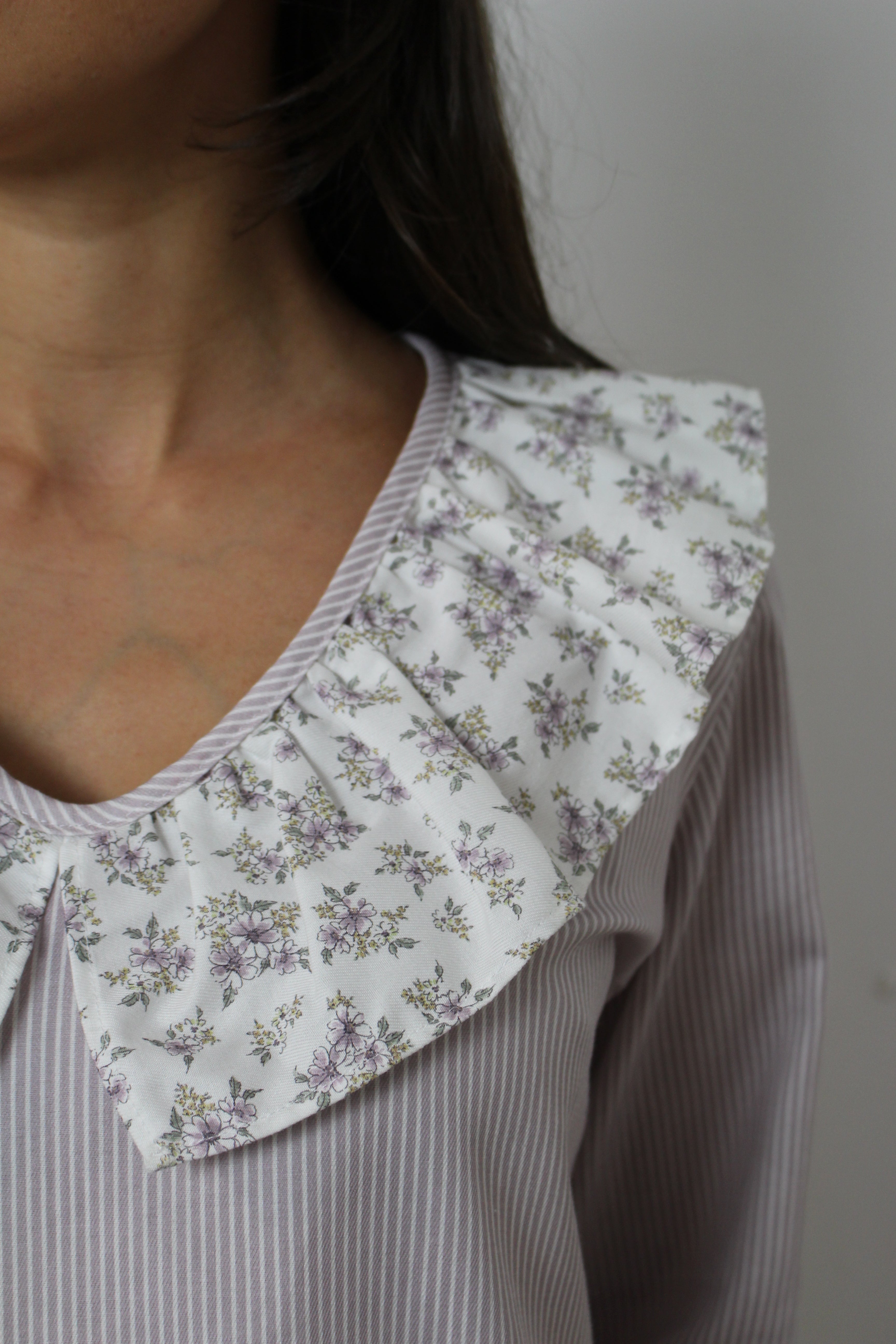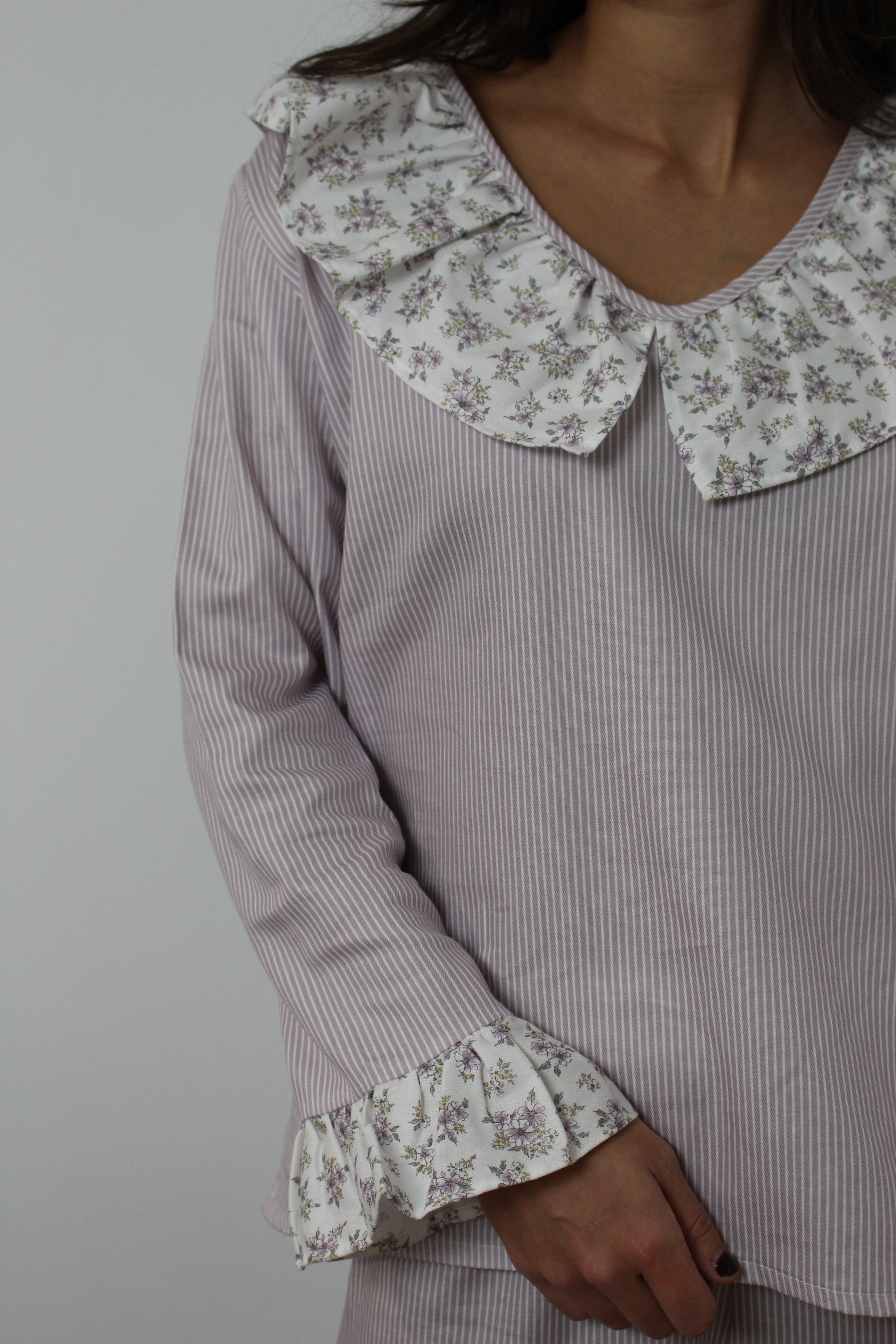La blusa estampada de rayas incorpora cuello y puños en contraste con el estampado floral, aportando delicadeza y armonía.