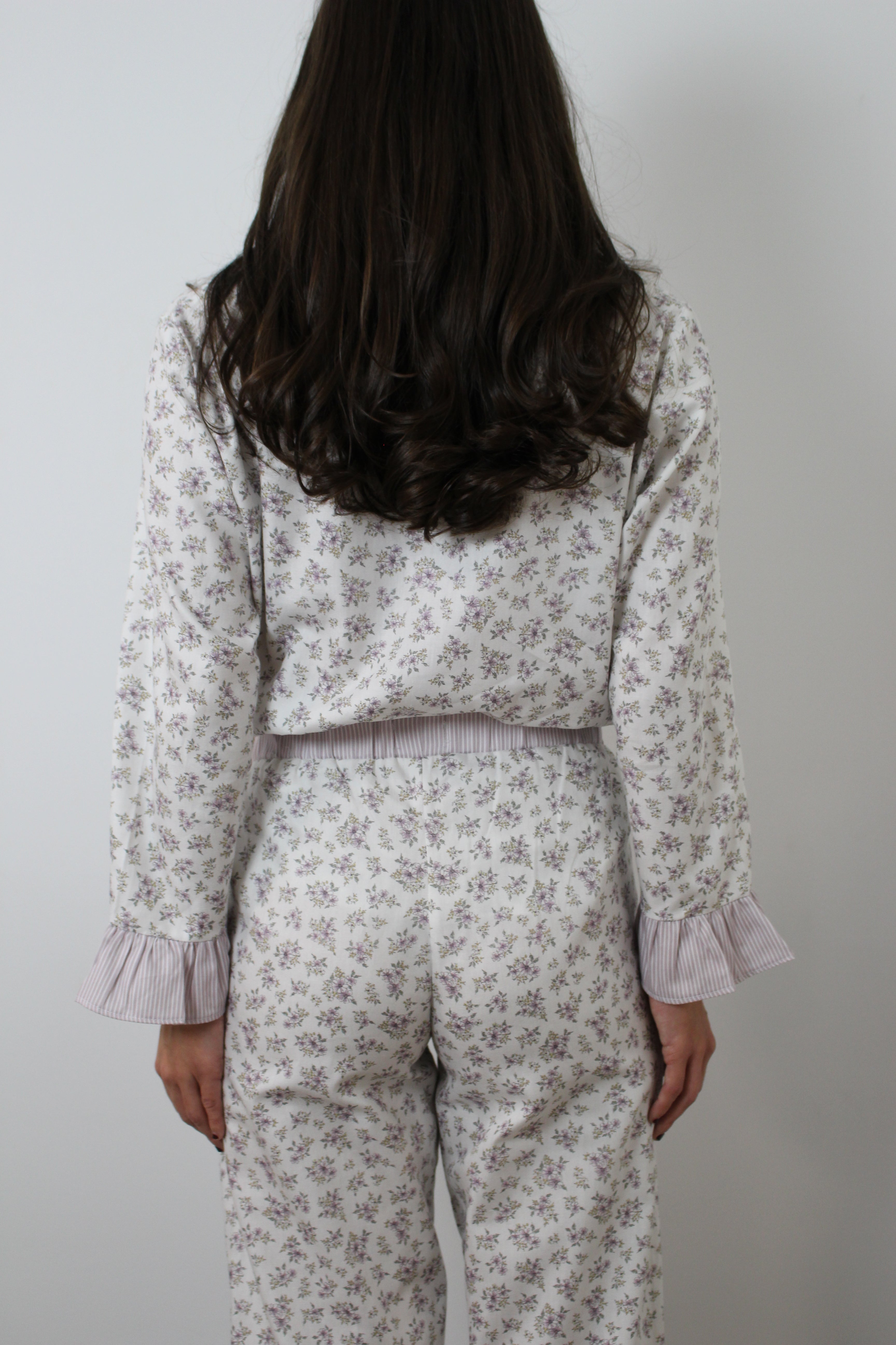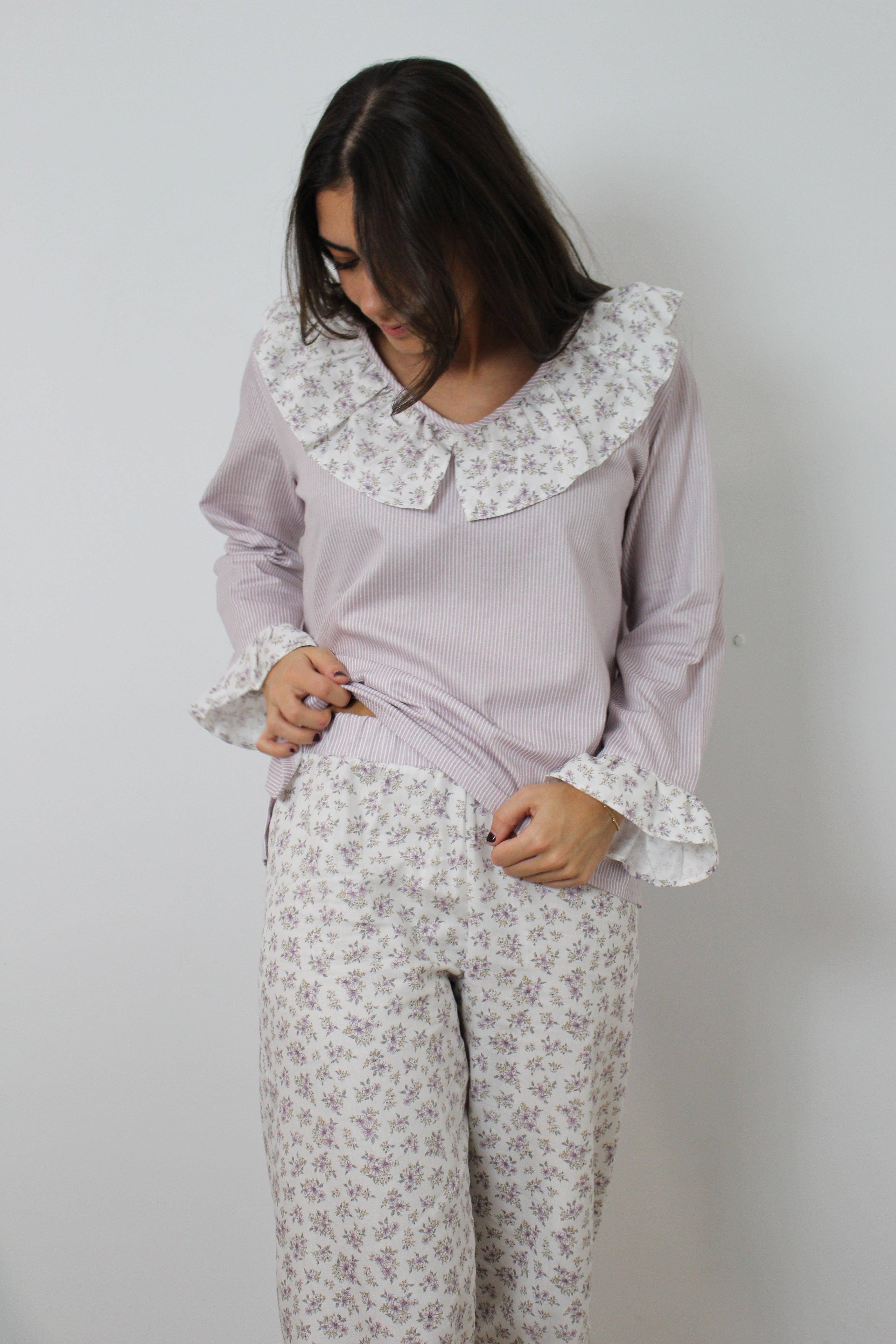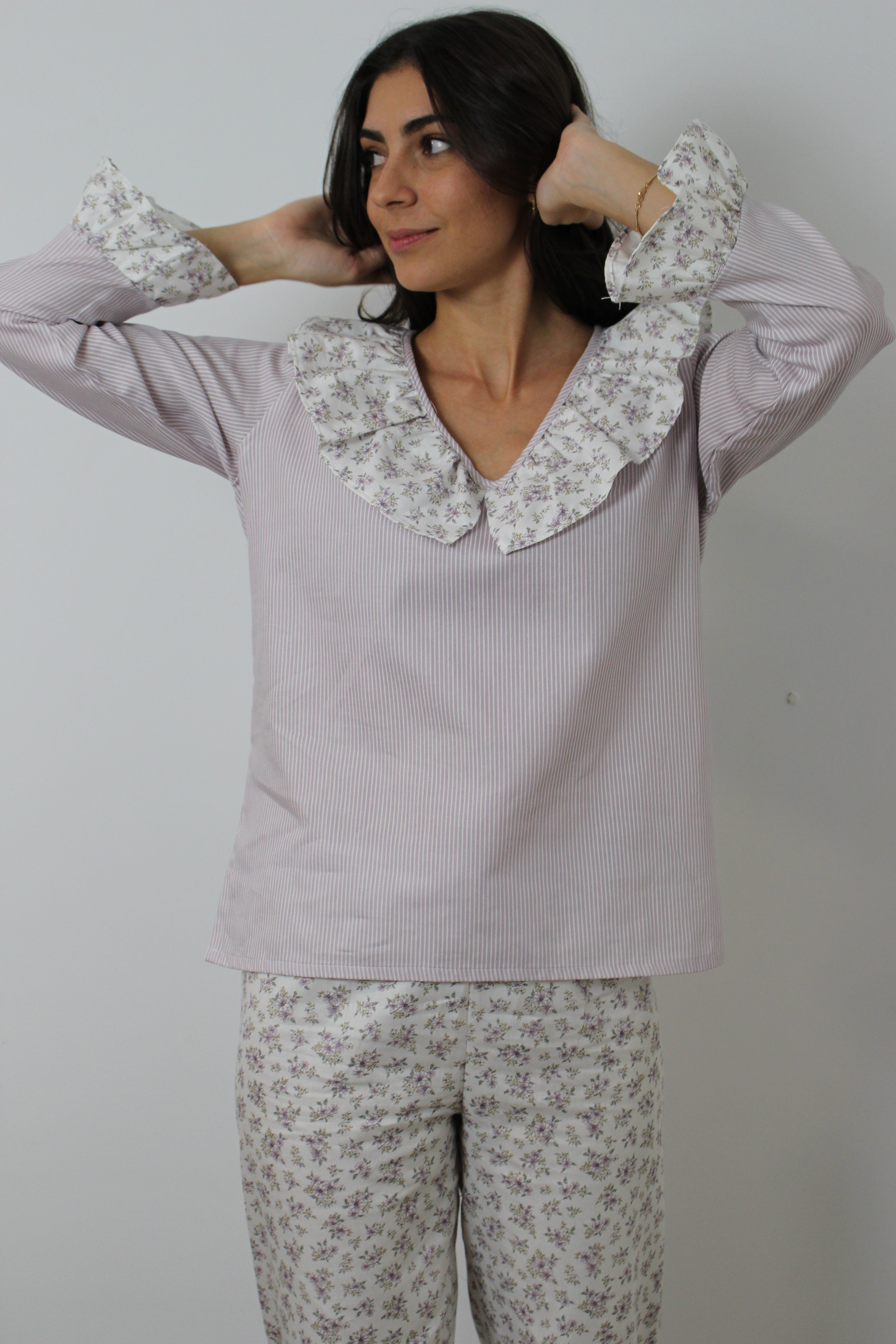 El pijama Calm combina piezas con estampado de rayas principal y detalles florales, confeccionadas en algodón 100% orgánico, suave y cómodo sobre la piel.