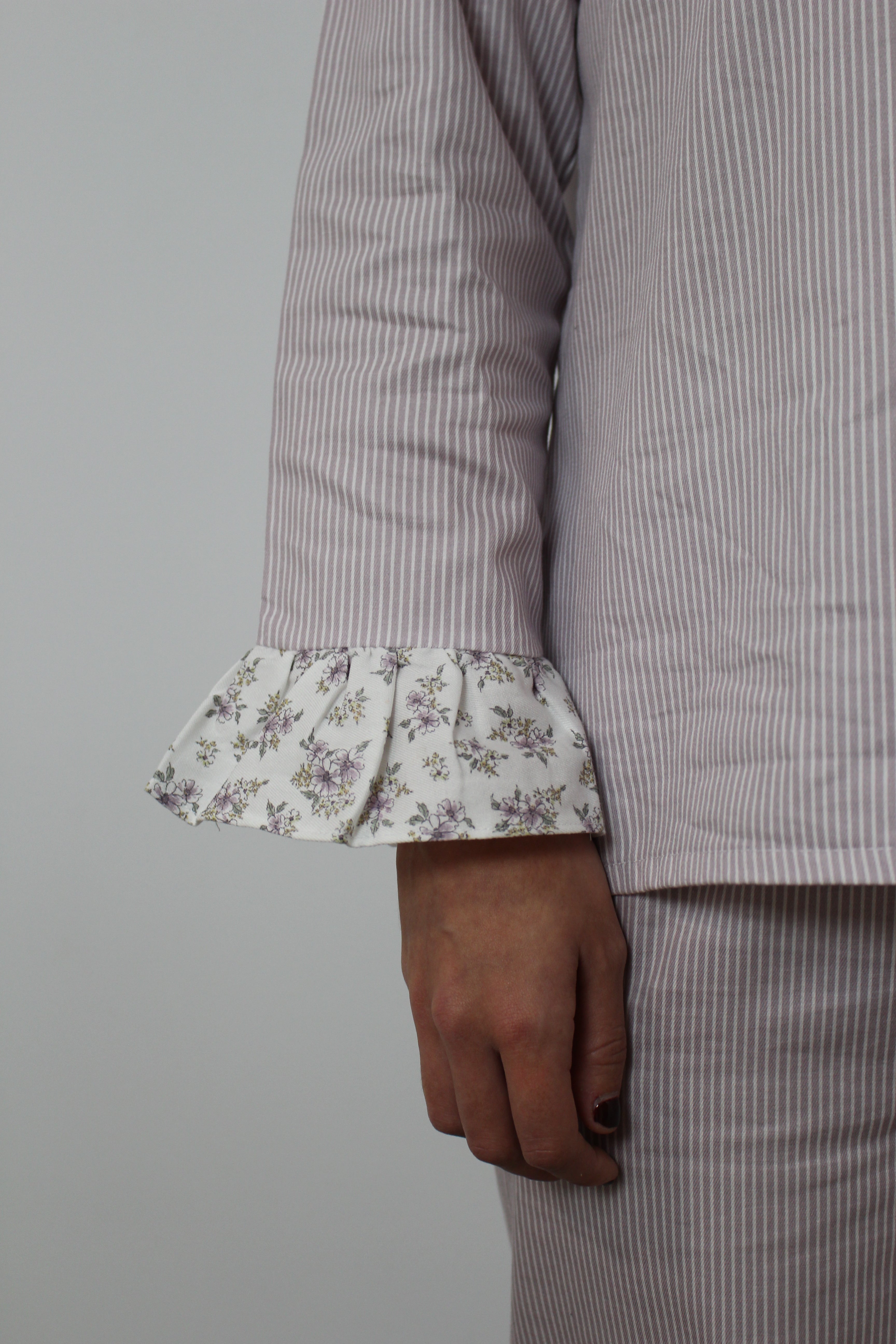 La blusa cuenta con cuello y puños en contraste con el estampado floral, aportando delicadeza y armonía.
