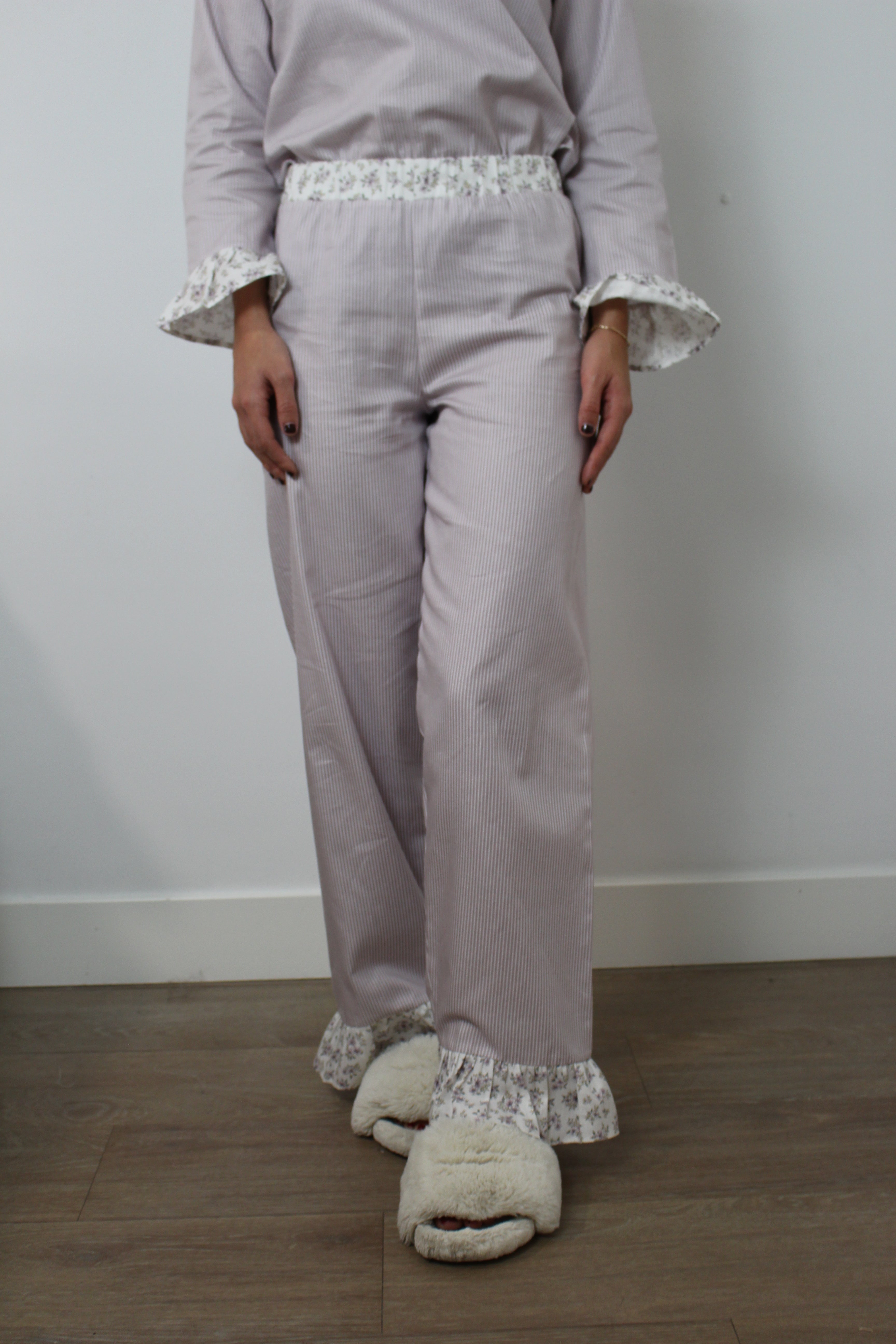 Los pantalones presentan corte recto, cinturilla elástica y volante en contraste con el estampado floral, ofreciendo comodidad y libertad de movimiento.