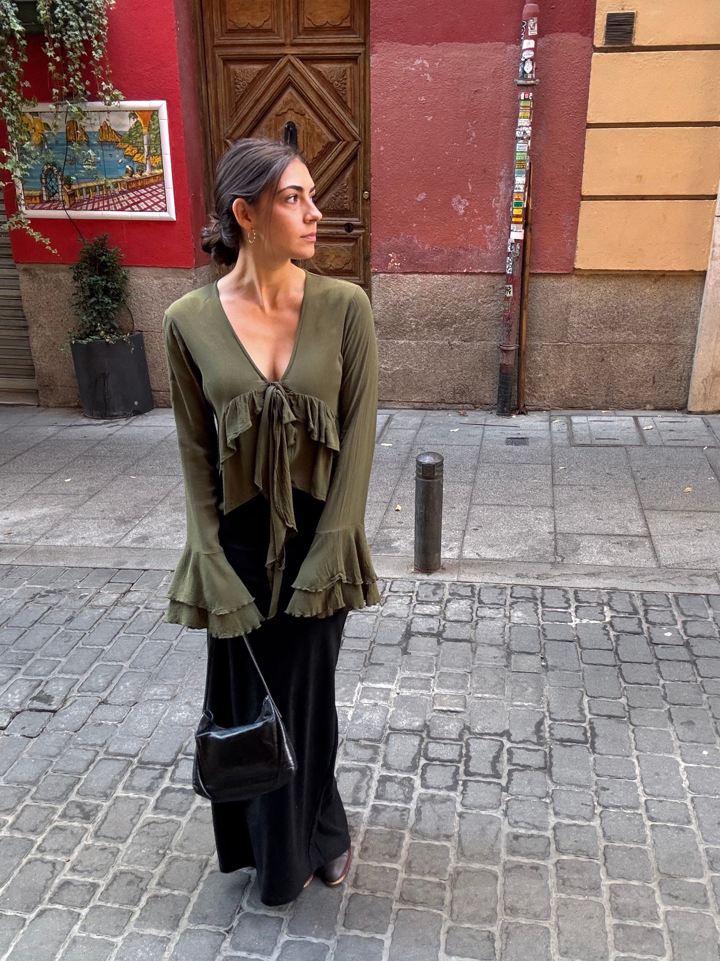 El tejido de 100% viscosa ha sido fabricado en un pequeño pueblo a las afueras de Atenas (Grecia) , y una vez llegó a nuestro Atelier en Madrid, Orlanda desarrolló el patrón para asegurar que siente a la perfección. Posteriormente, la prenda fue cortada a mano y confeccionada por nuestro equipo en nuestro propio Atelier en Madrid.
